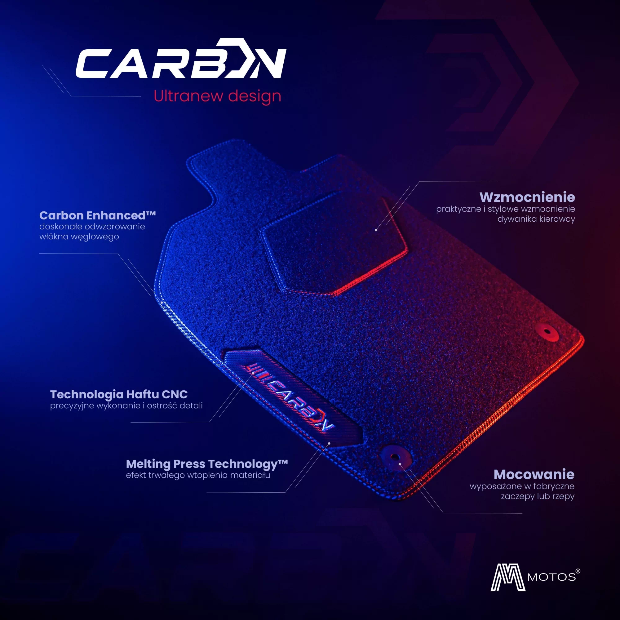 Produkowane przez Motos dywaniki z motywem włókna węglowego są zwieńczeniem lat doświadczenia i inwestycji w know-how. Niepowtarzalne wzornictwo gwarantuje, że wnętrze Twojego pojazdu zmieni się nie do poznania./carbon-zd-opis3.webp)